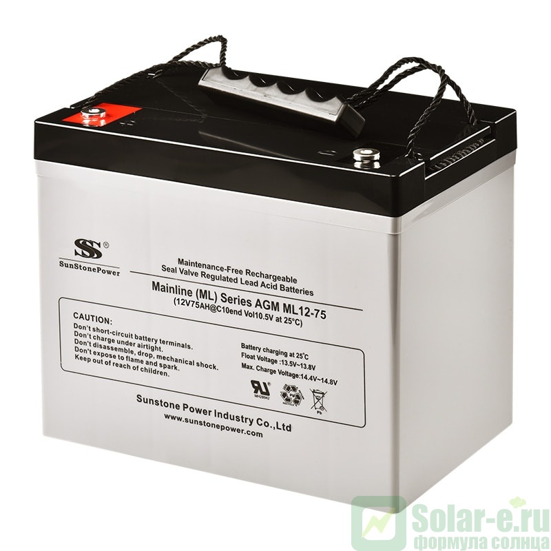 Свинцово-кислотный тяговый аккумулятор SunStonePower ML 75Ач 12В AGM это тяговый аккумулятор глубокого разряда ( deep cycle ) используемый в качестве источника питания в системах как автономного так и резервного электроснабжения, а так же лодочных моторов и любых других электродвигателей с напряжением 12 Вольт. Данные аккумуляторы изготовлены по технологии с абсорбированным электролитом (AGM). В батареях серии ML применена более совершенная конструкция решеток из особо чистого сплава свинца, что увеличивает срок службы и улучшает разрядные характеристики.