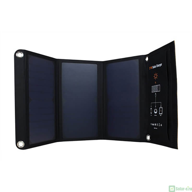 Положить солнечную панель в раскрытом виде под прямые солнечные лучи (загорится синий индикатор), с подключенным к нему устройством, подождать полного заряда устройства, закрыть солнечную батарею, отключить заряженное устройство.