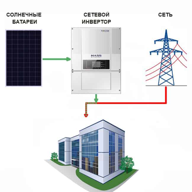 Сетевая солнечная электростанция состоит только из солнечных модулей и сетевого инвертора - аккумуляторы не требуются. В СЭС используется метод прямого преобразования солнечного излучения в электрическую энергию с ее последующей подачей в вашу электросеть. Система предназначена для уменьшения потребляемой энергии от центральной электросети, а также увеличения ее суммарной мощности. СЭС работает одновременно с вашей сетью, добавляя сгенерированную ею энергию на питание нагрузки.